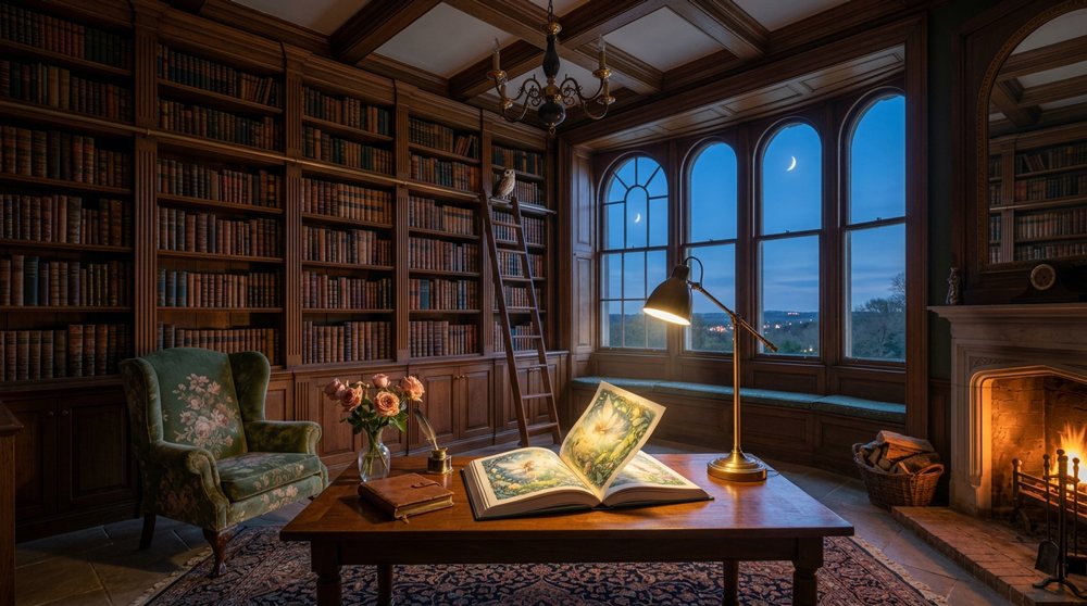 A quiet space of glowing pages, inspiration, and stories waiting to unfold.